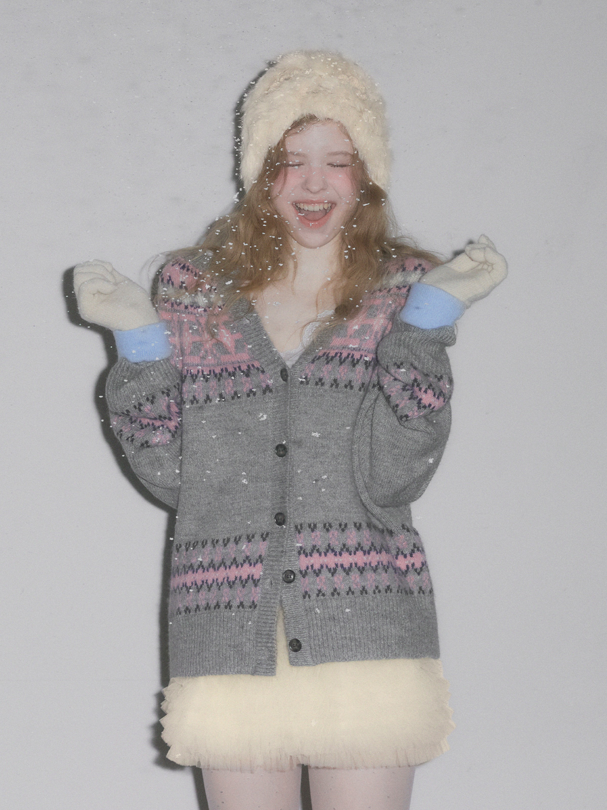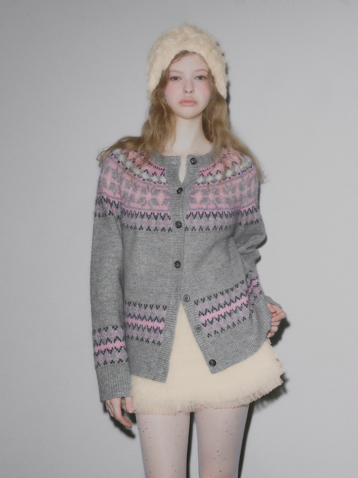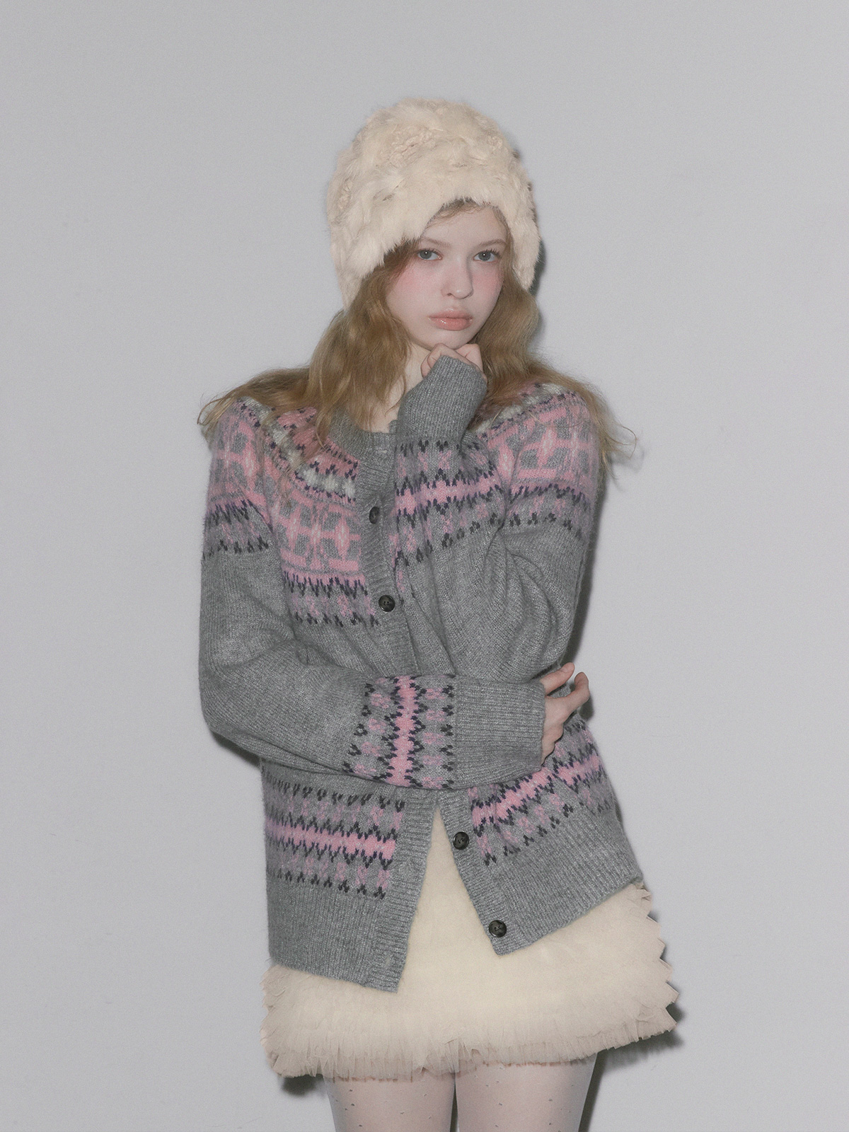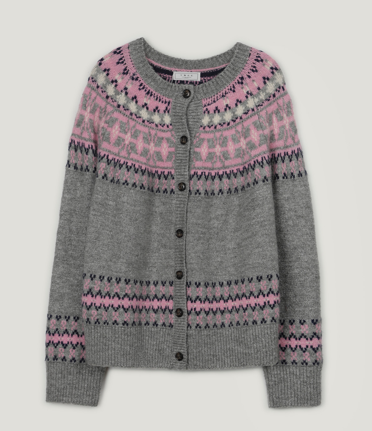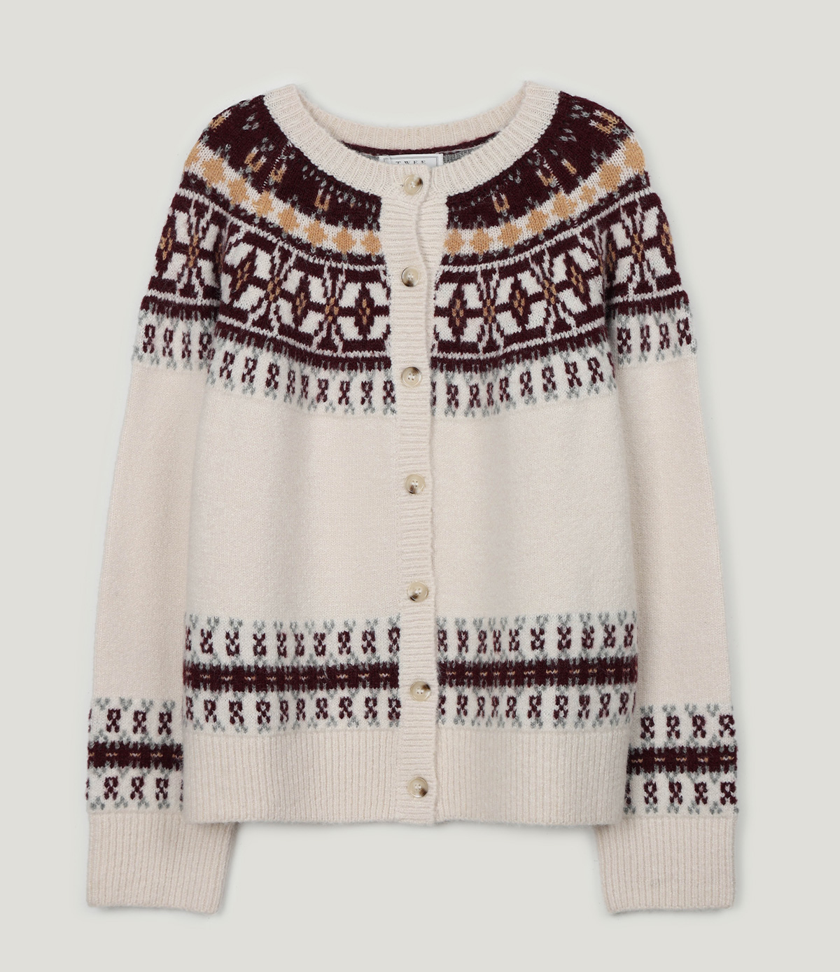 Dieser langärmelige Strickcardigan verleiht mit seinem nordischen Muster eine winterliche Atmosphäre.