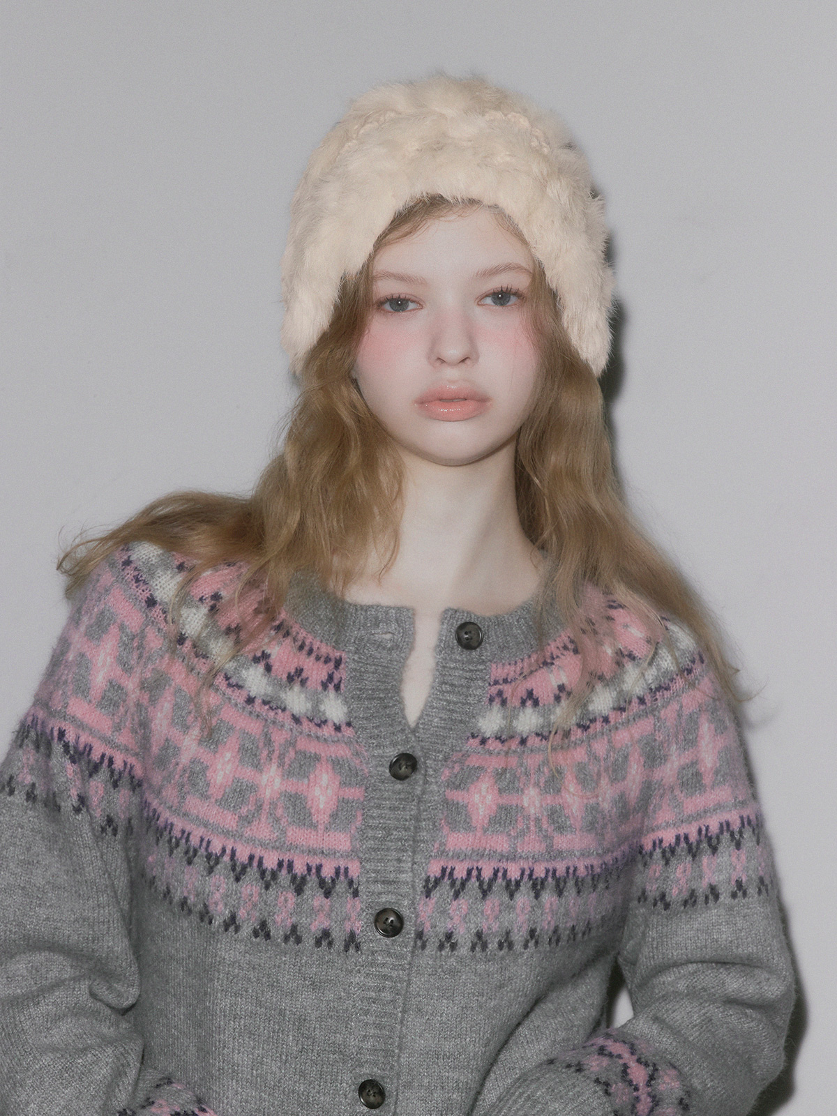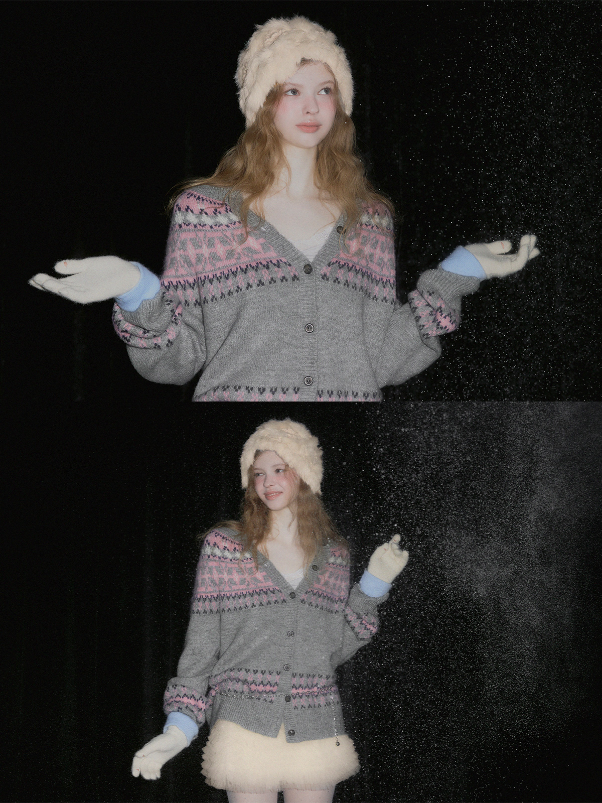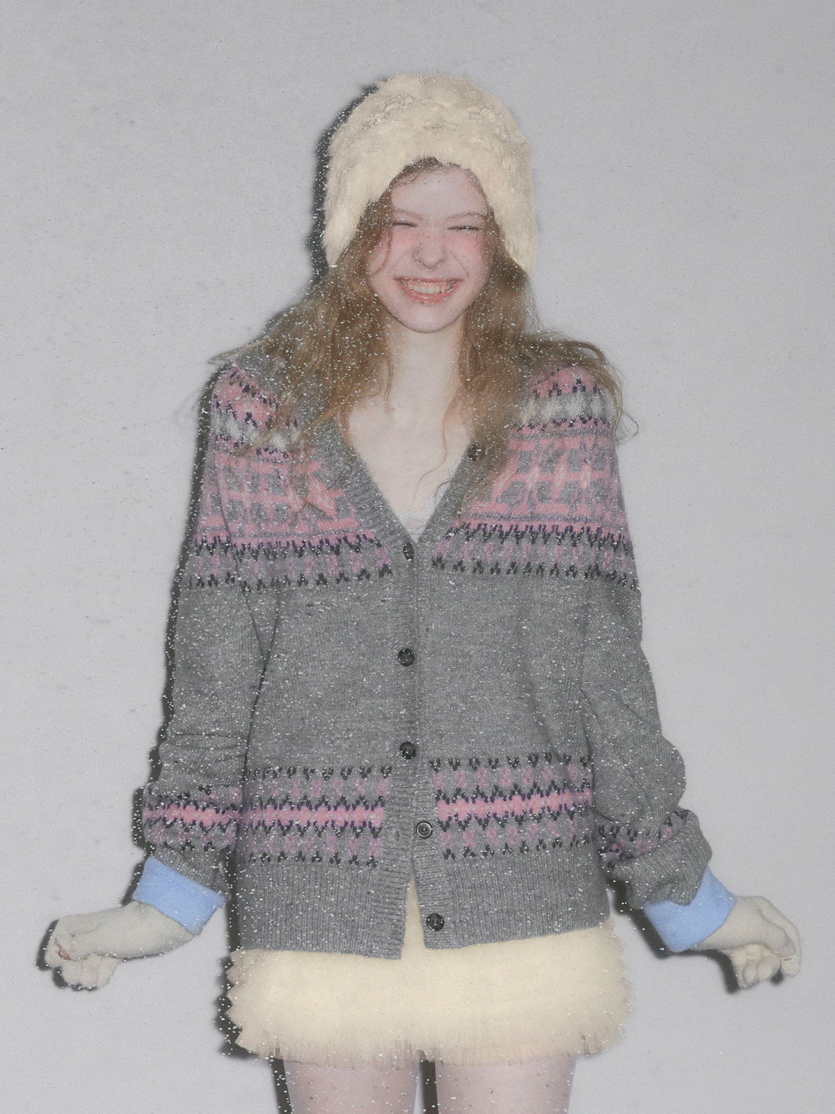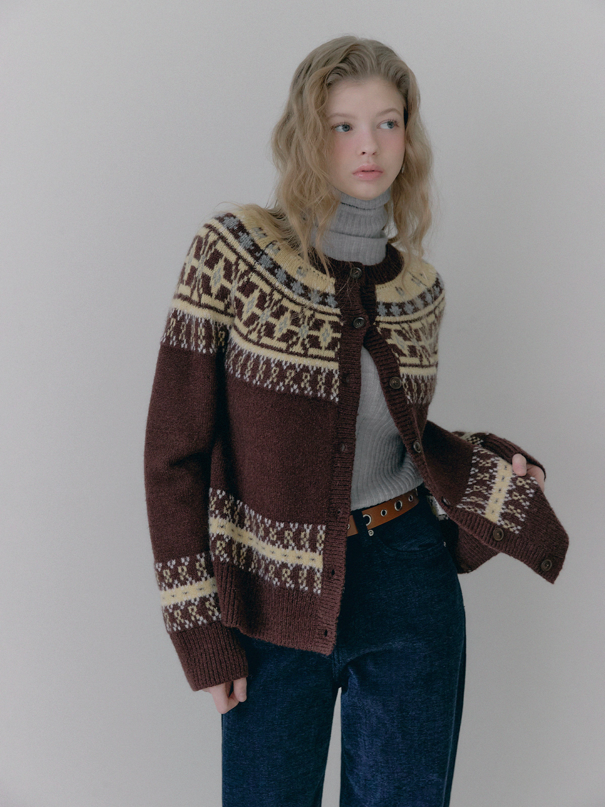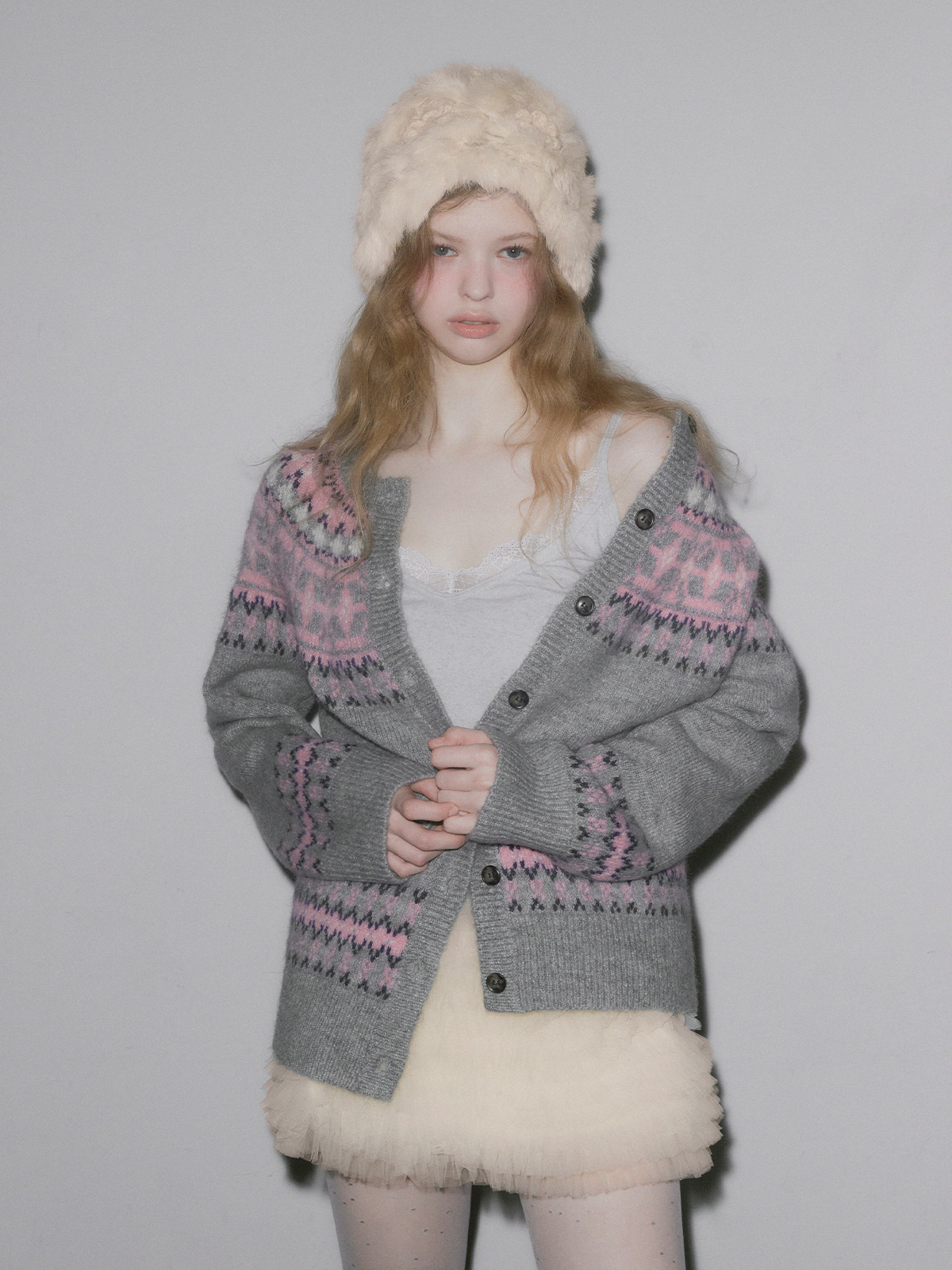 Dieser langärmelige Strickcardigan verleiht mit seinem nordischen Muster eine winterliche Atmosphäre.