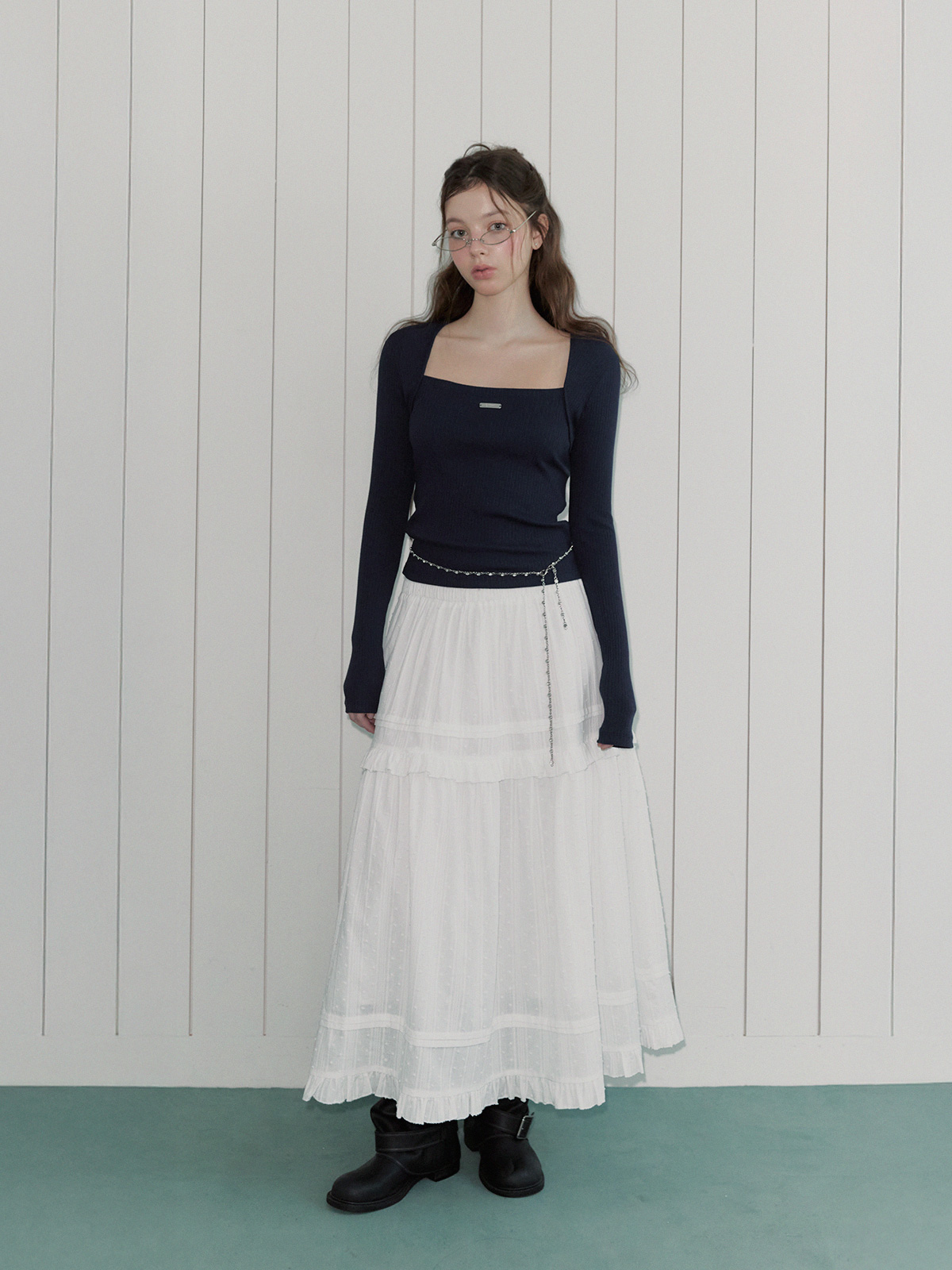 Es ist ein Teil mit quadratischem Ausschnitt, das eine feminine Atmosphäre schafft und durch den vorderen Symbolanhänger akzentuiert wird.