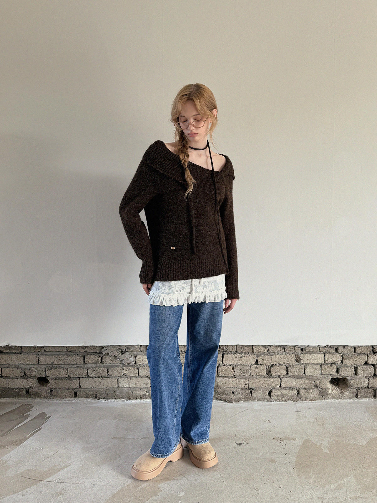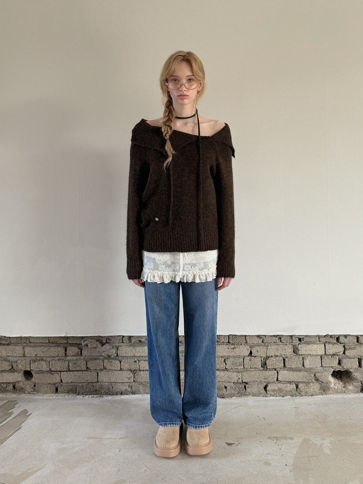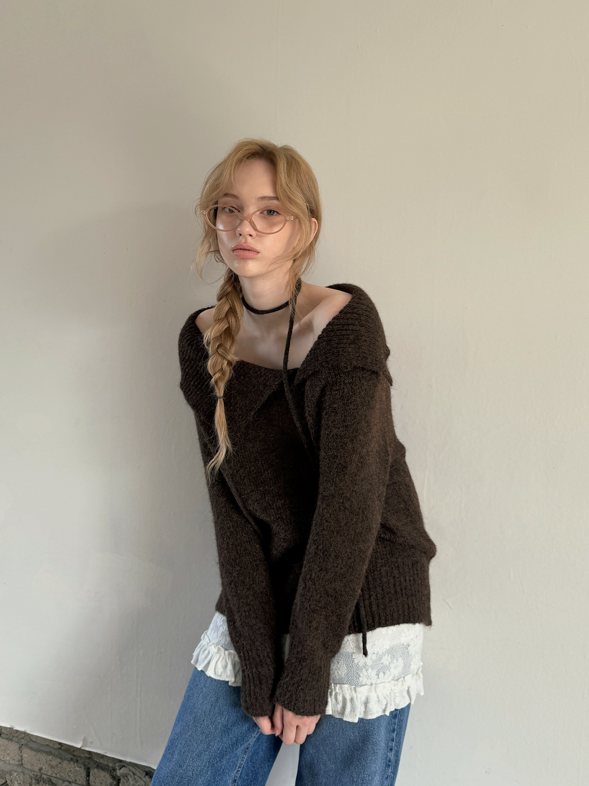 [TWEE]Ecle 비대칭 넥 루즈핏 니트 (스트랩 포함)