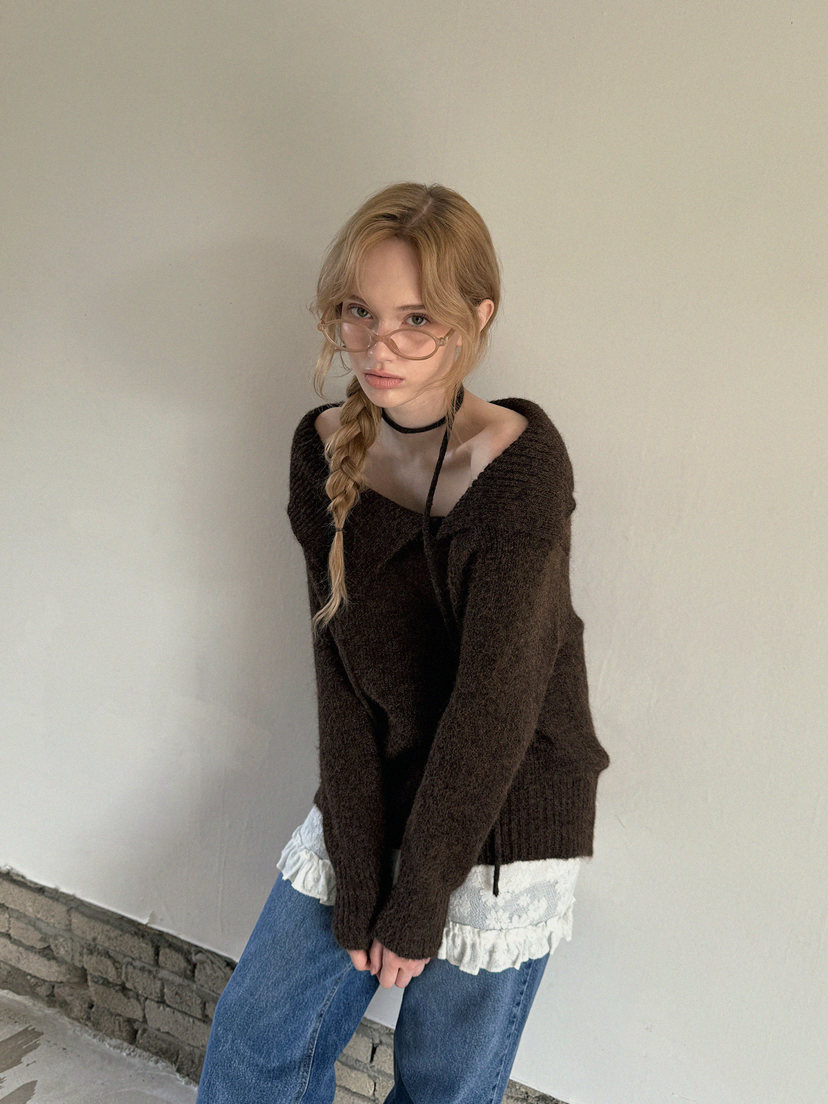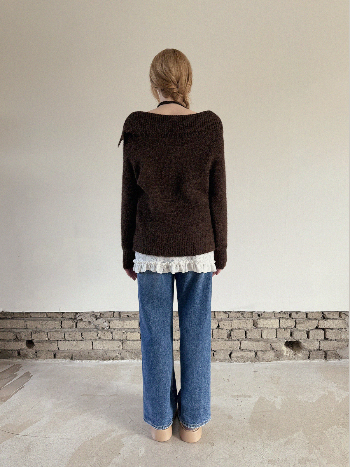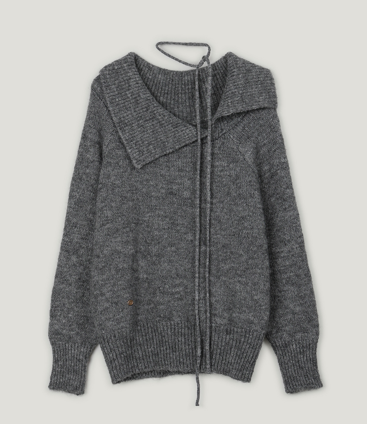 이 루즈핏 니트는 독특하고 비대칭적인 넥라인이 특징입니다.