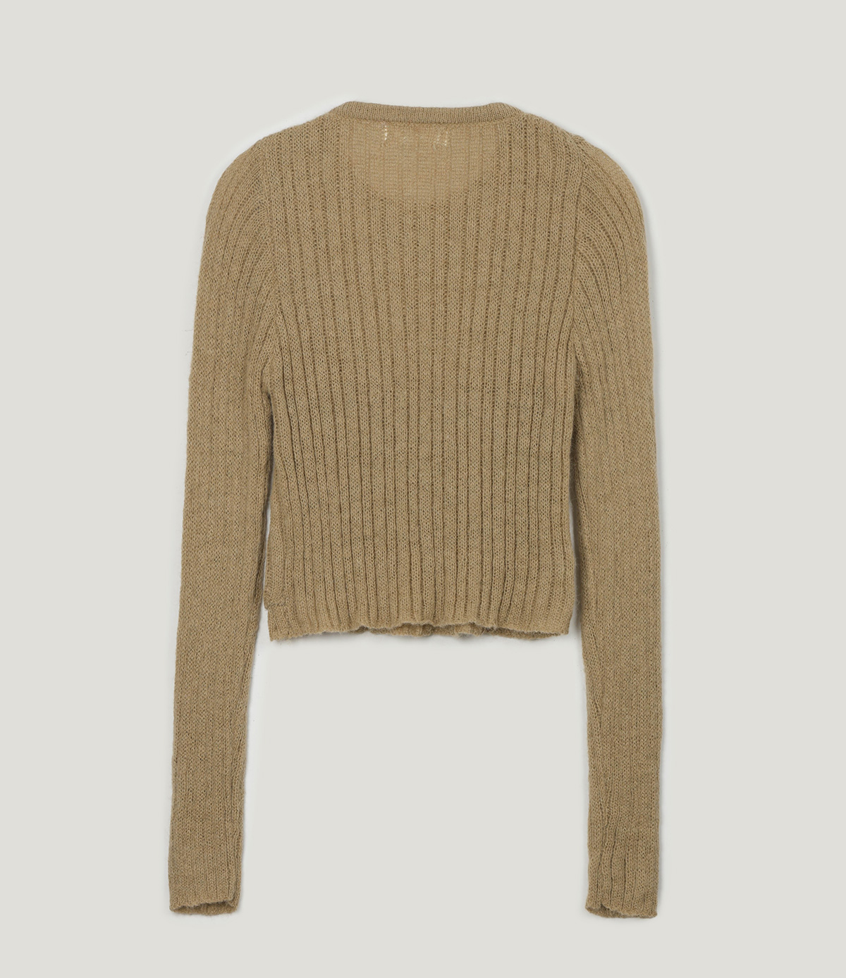 This long-sleeved knit features a layered design. Its cropped length makes it easy to wear, and even when worn alone, it feels like a complete outfit, making it a highly collectible item.