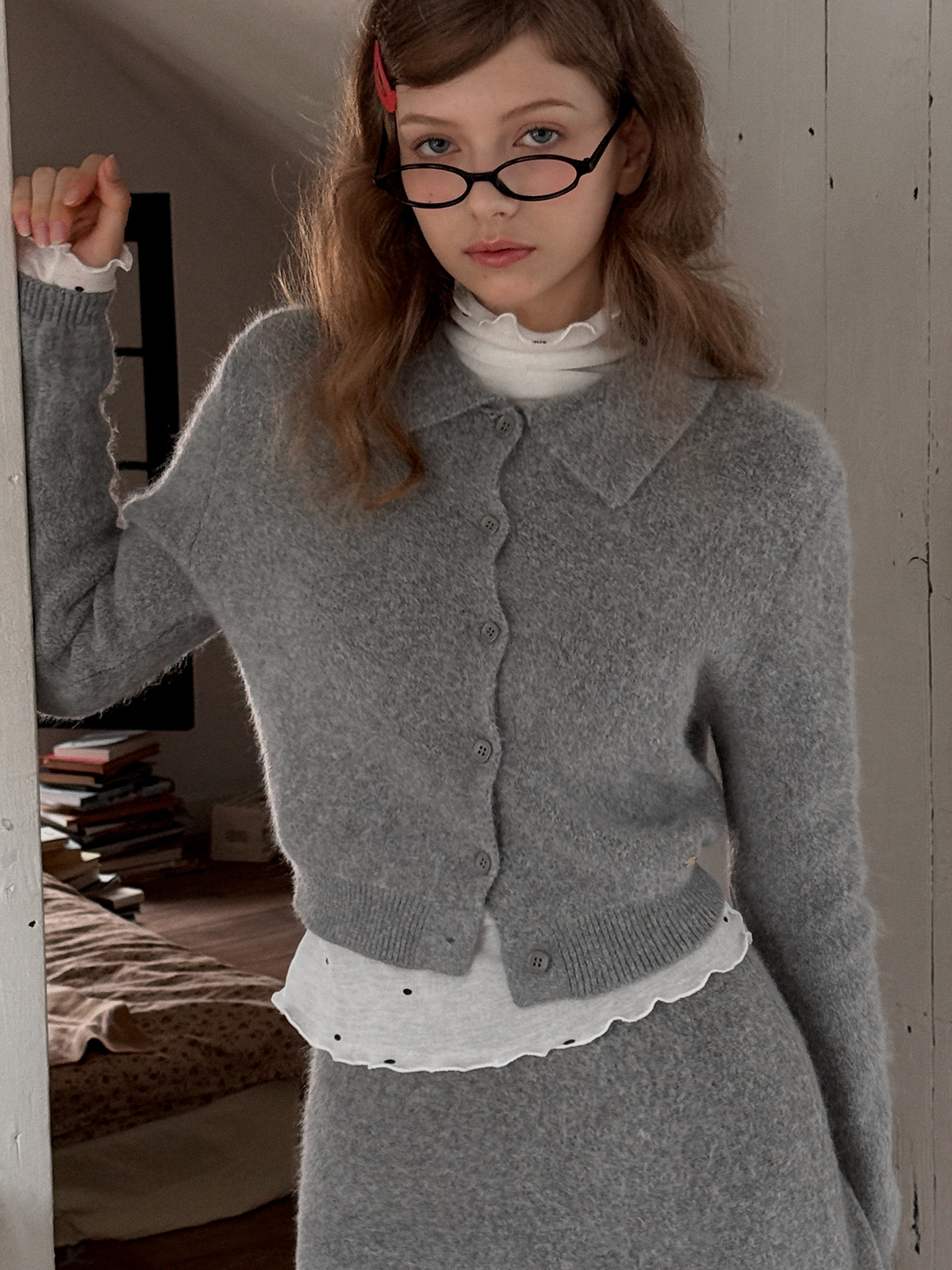 It can also be styled as a set with the "Entz Collar Hair Knit Cardigan."