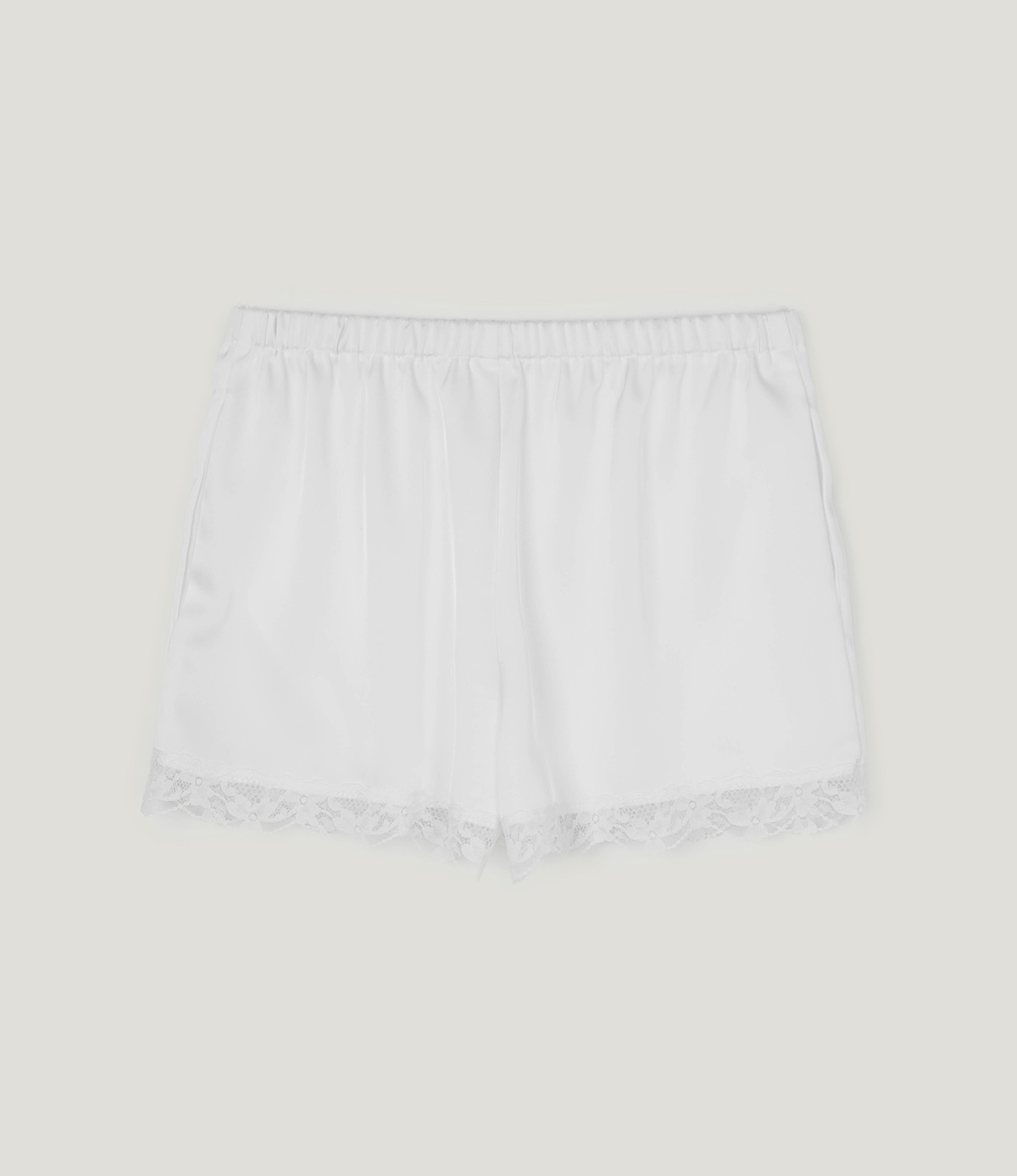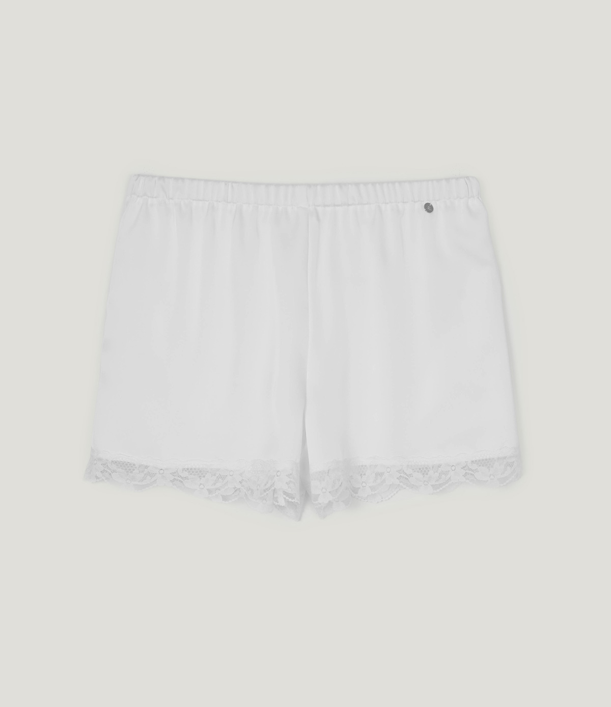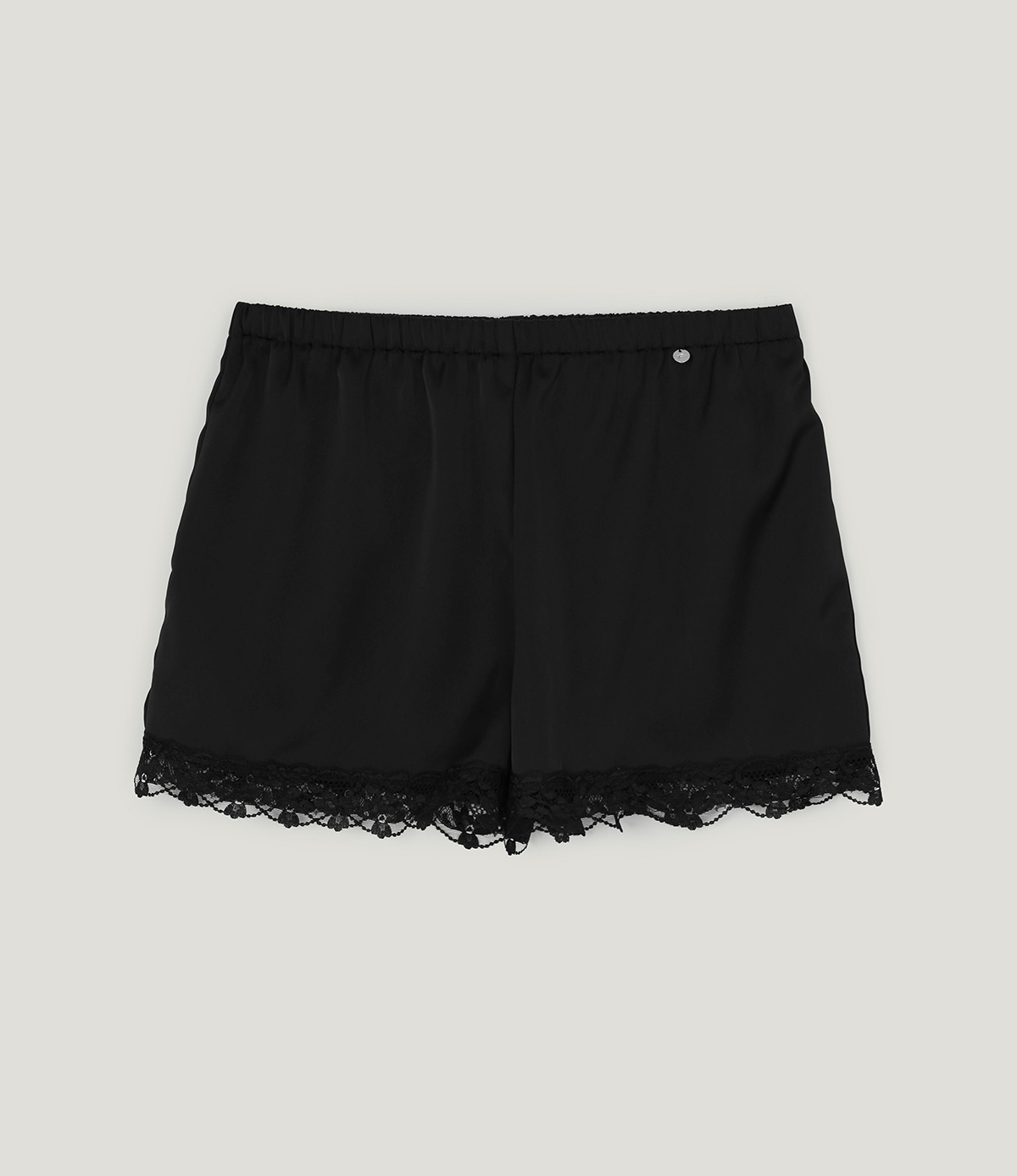 These women's satin shorts feature eye-catching lace detailing at the hem for an elegant look. Designed with a full elastic waistband and side pockets, they provide all-day comfort and a perfect fit. The high-quality satin fabric delivers a luxurious vibe that complements the delicate hem lace, making them stylish and versatile for daily and casual wear.