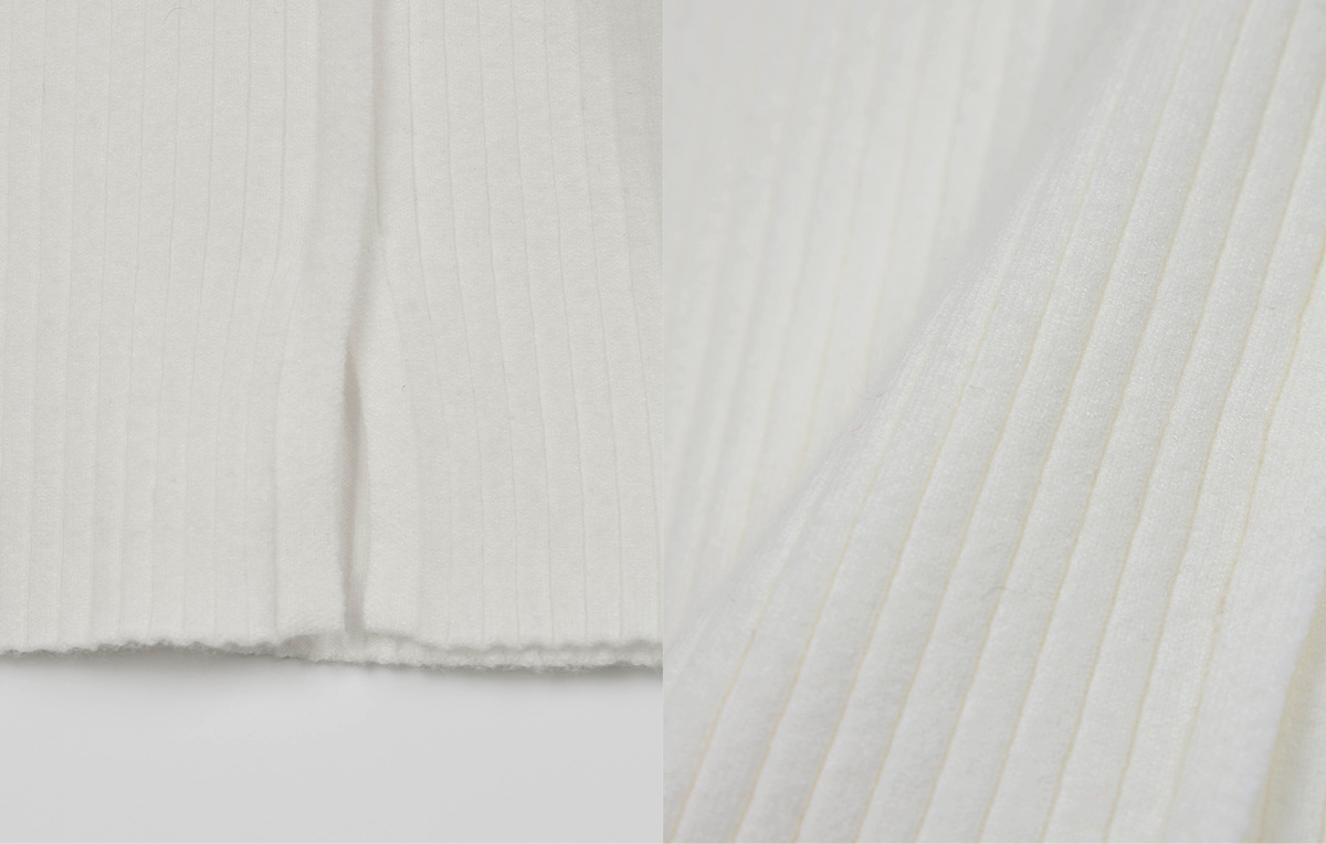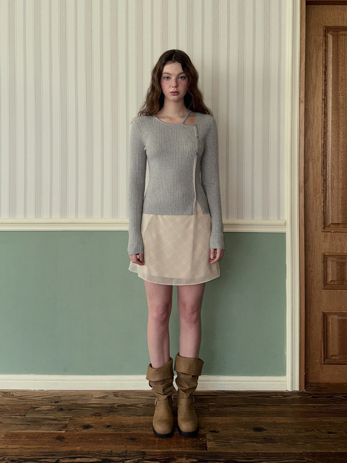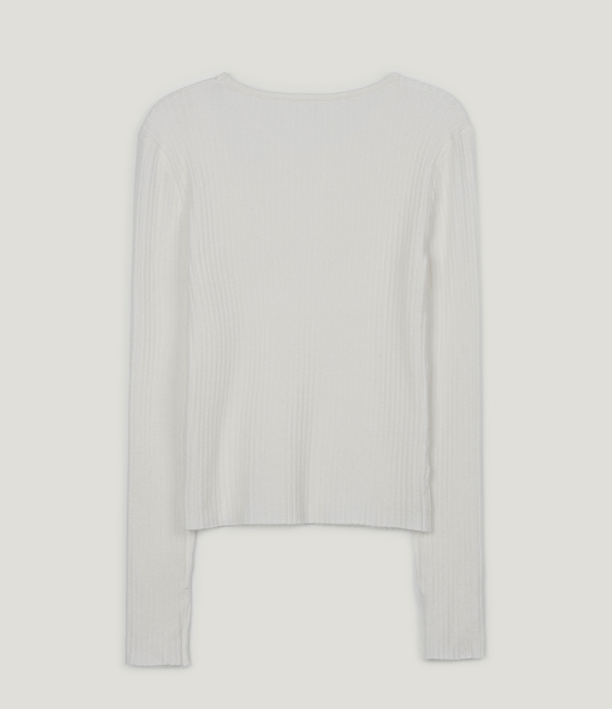 This is a long-sleeve knit featuring an asymmetrical hem slit and button details as its key design points. It creates an impactful daily style with a simple, structured silhouette, and can be worn alone as a statement piece for minimalist styling.