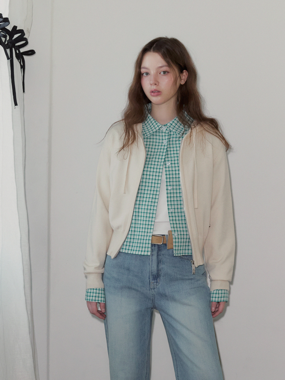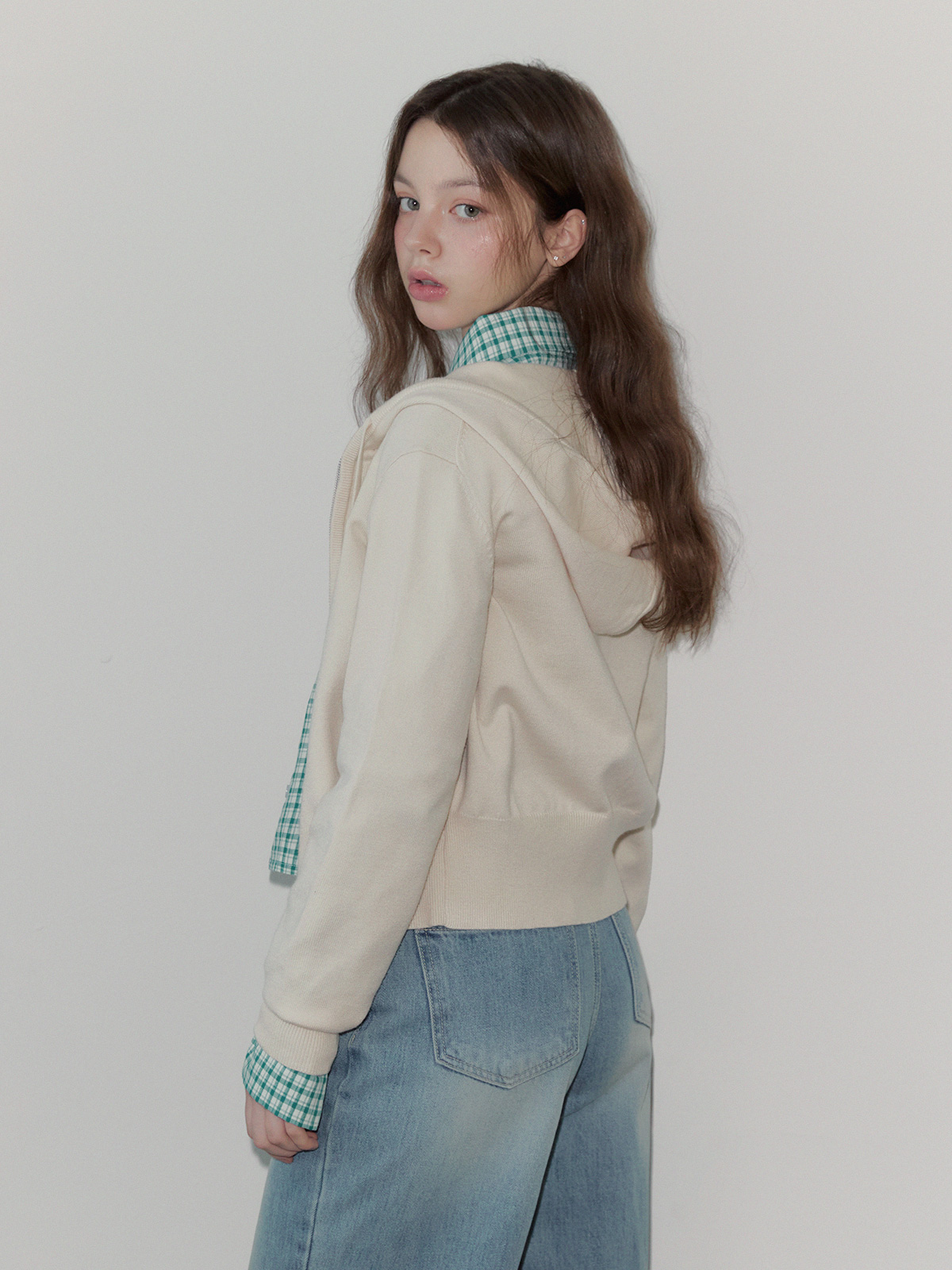 This is a knit hooded zip-up with a casual yet charming appeal.