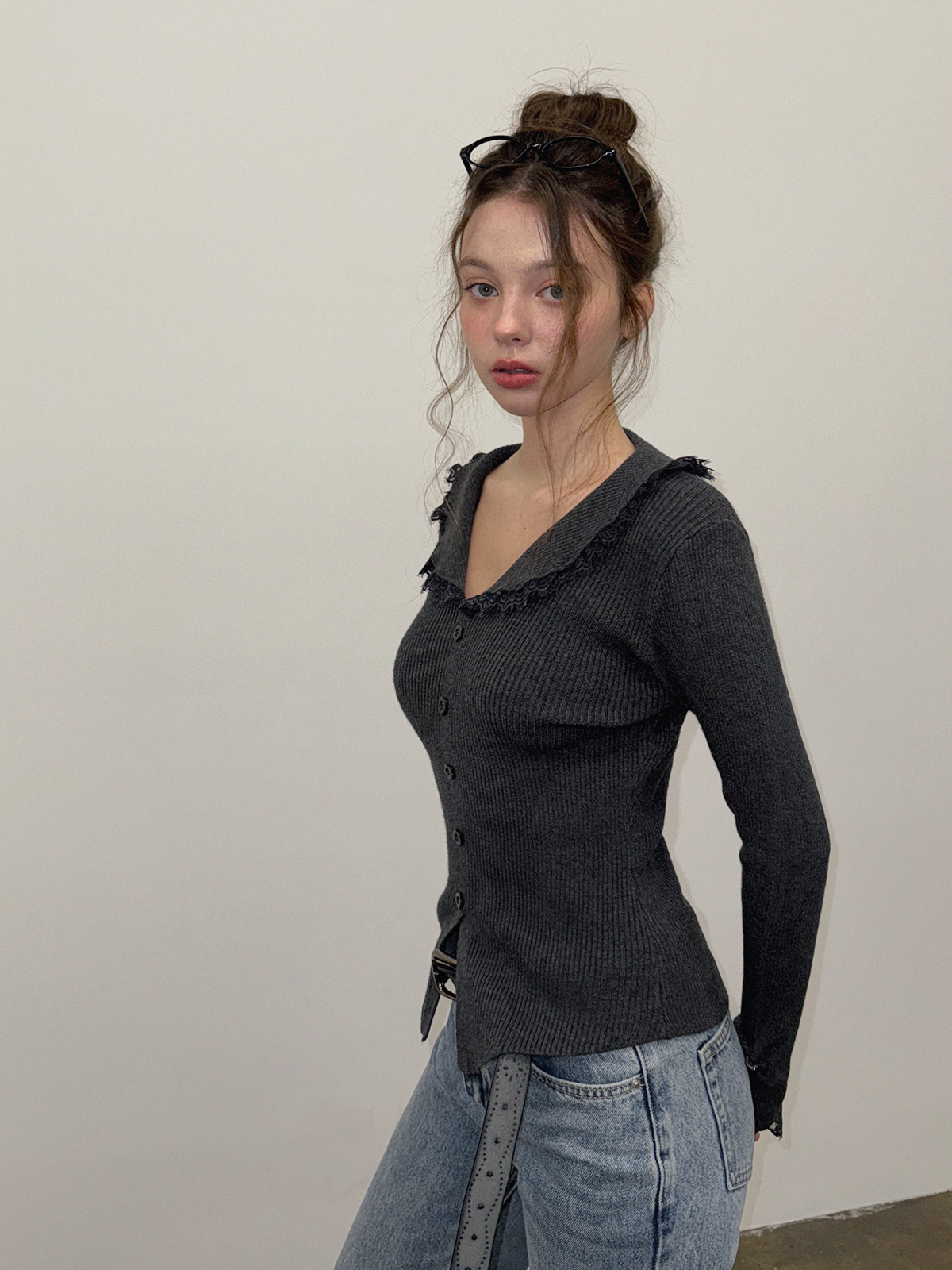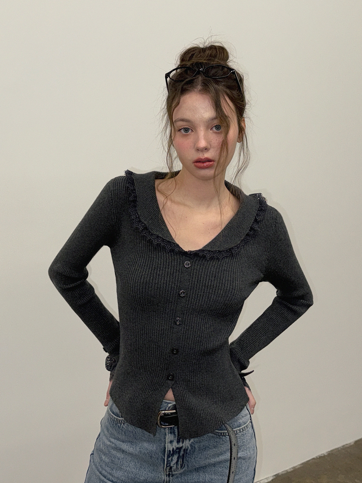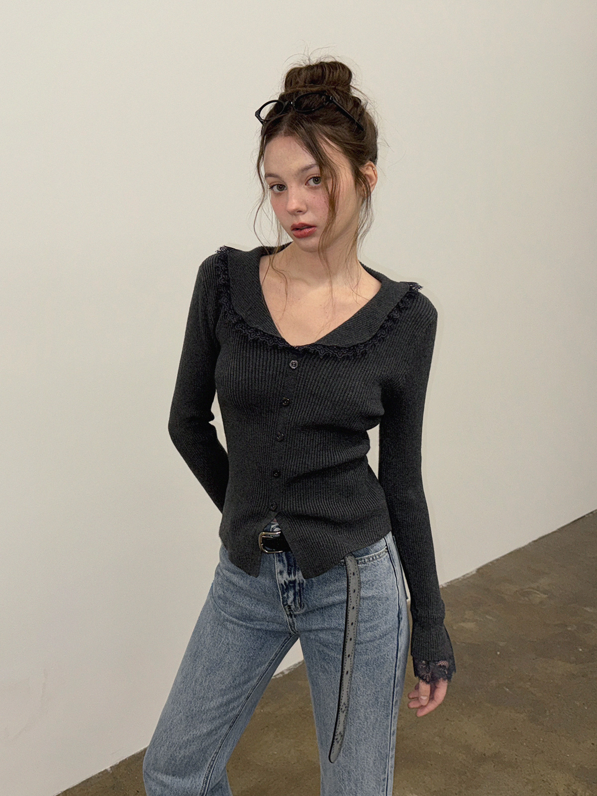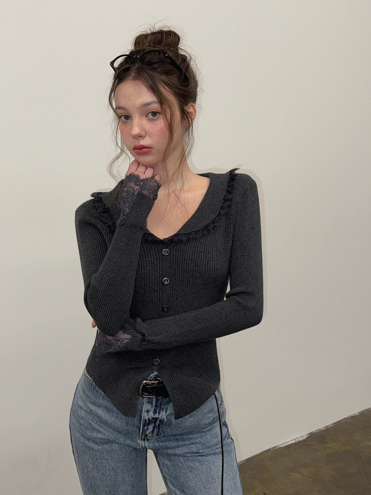 The round collar creates a clean silhouette, and lace details along the neckline create a feminine yet sophisticated look.