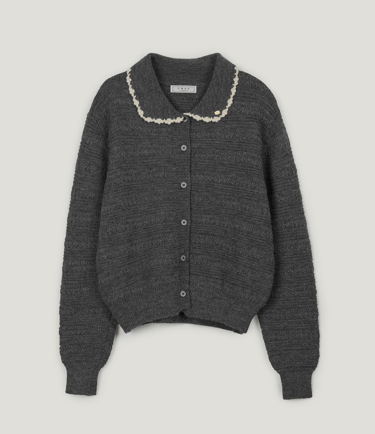 Chiếc áo khoác len tay dài này có chi tiết cổ áo đối lập màu sắc. Các nút cài phía trước giúp mở và đóng áo, và họa tiết sọc nổi ba chiều trên toàn bộ áo tạo nên vẻ ngoài thoải mái nhưng vẫn thời trang.