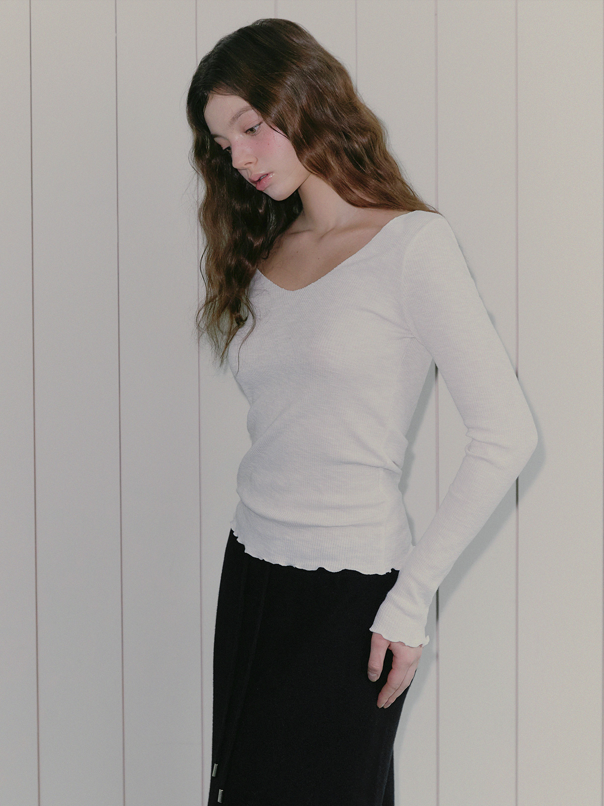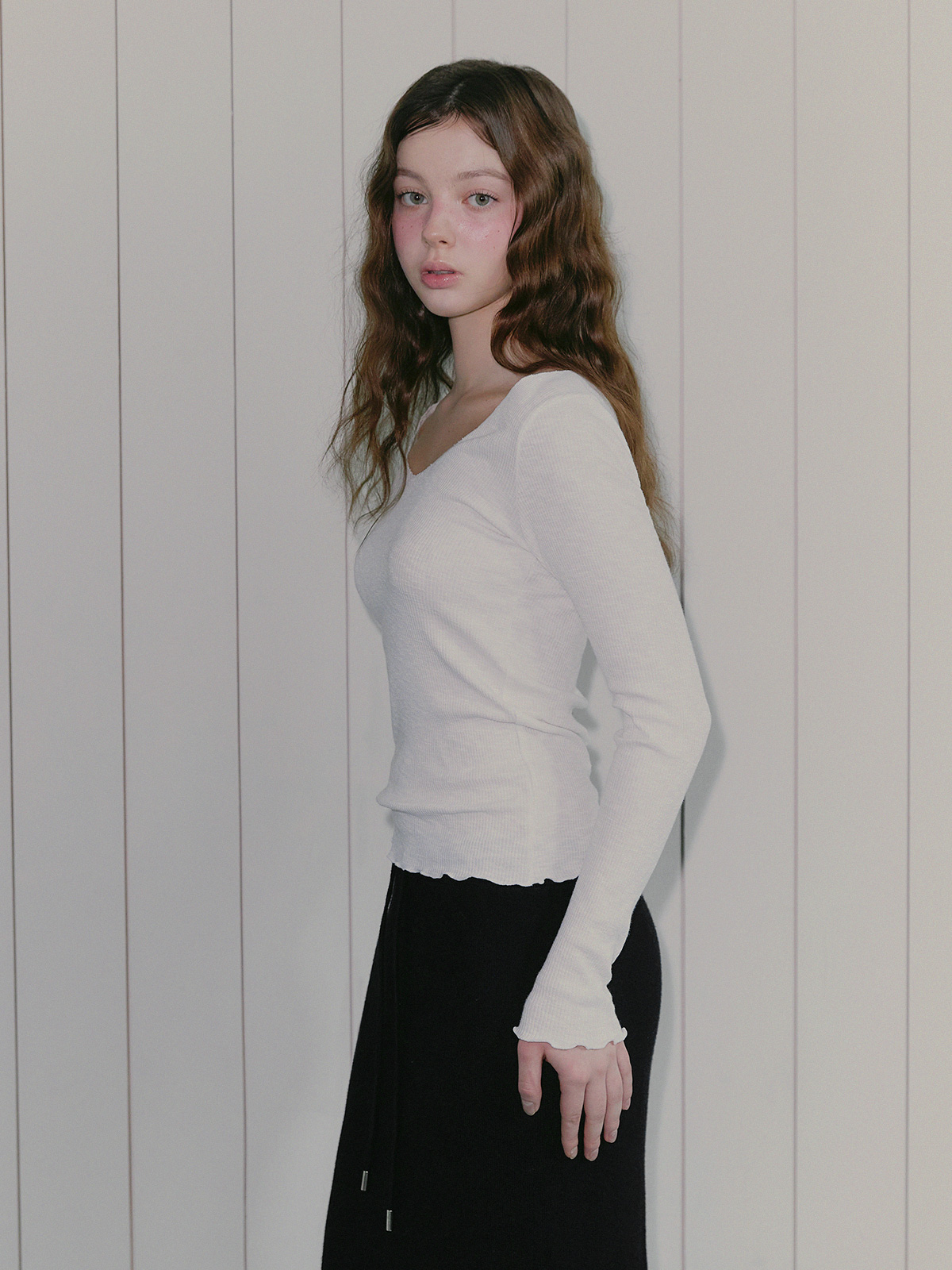 它由V领构成,款式在下摆和袖口处增加了波浪细节。