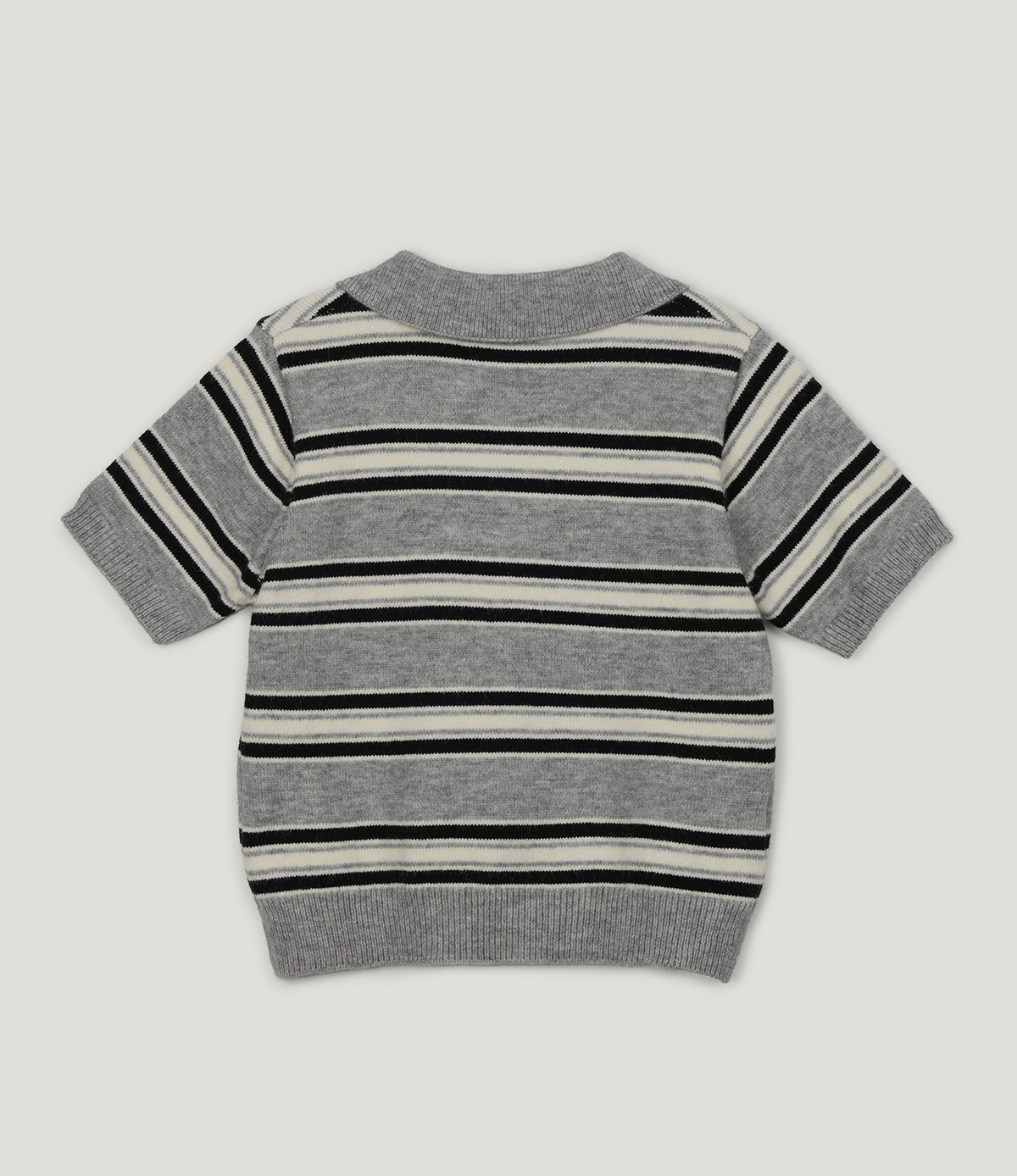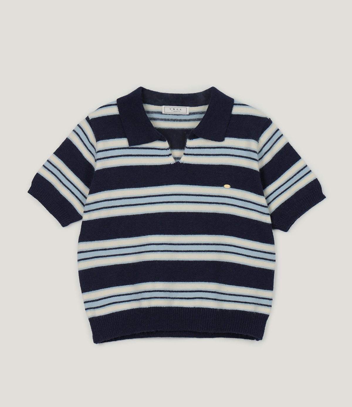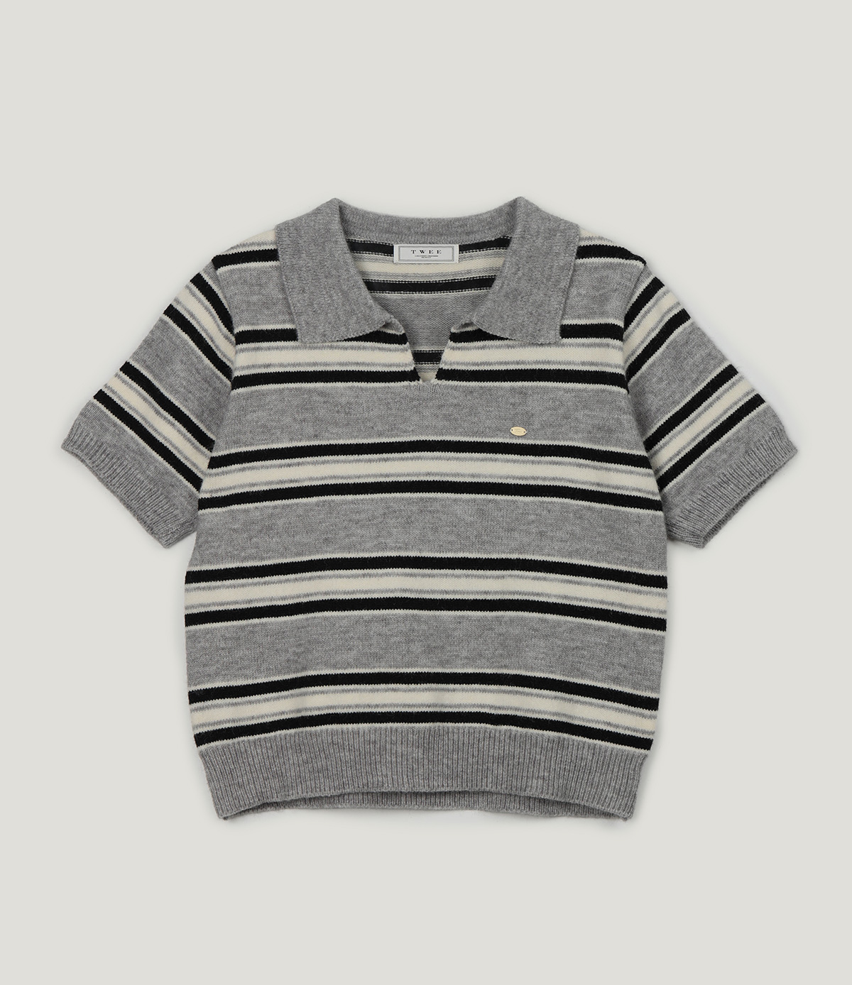上衣為短袖針織衫,帶有翻領設計,非常適合日常穿著。