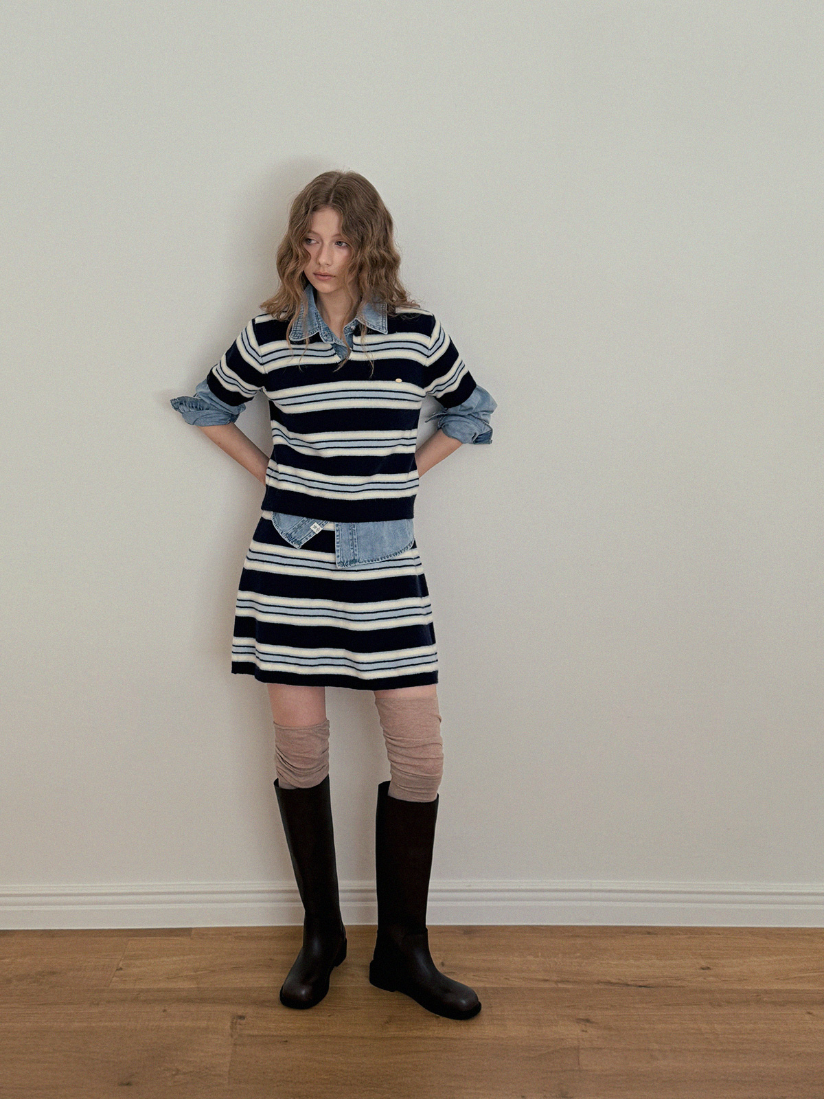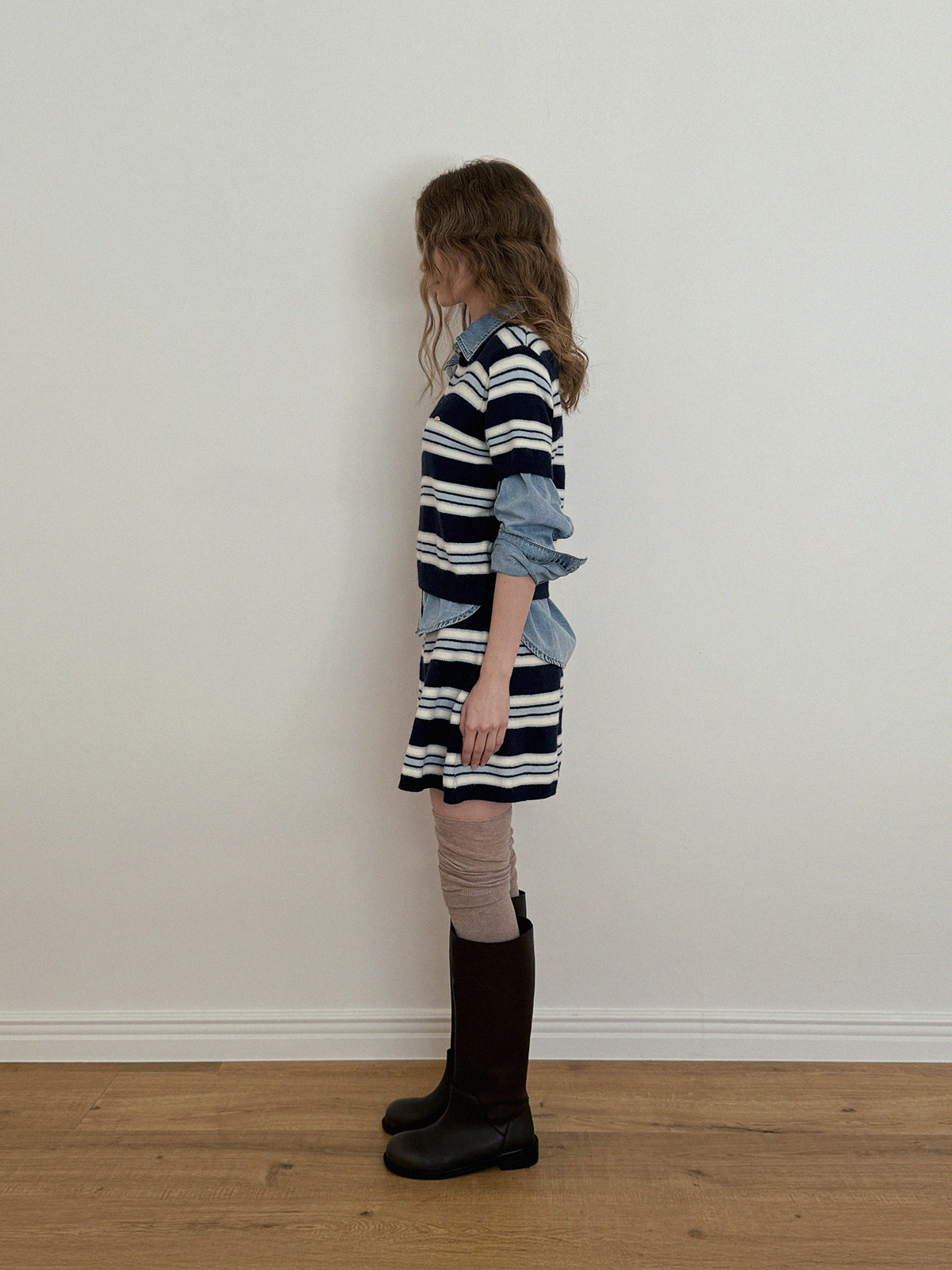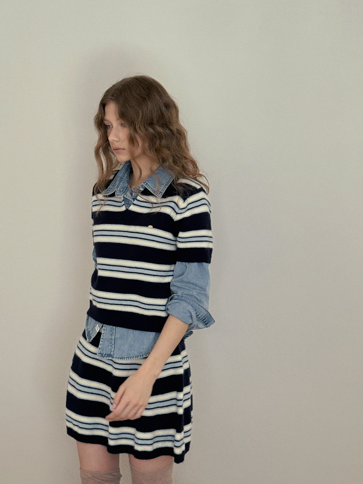 上衣為短袖針織衫,帶有翻領設計,非常適合日常穿著。